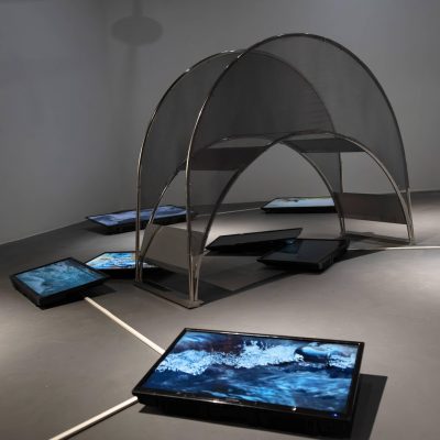 The work ‘Meta Ark’ poses the question of origins and the birth of new constellations. It is a structure that is portable so lingers on the edge of discovery. Where did it come from and where is it going to, is it welcomed or does it signify an unwanted intrusion. Whilst the fabrication points to a future yet to come, it also retains a memory of what is retained from archaic imagination. It is both a material structure based on advanced fabrication techniques and an image surfacing from the collective imaginary. It is both strange (detached) and familiar that mixes a constellation of images within its fabric.