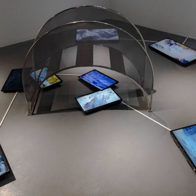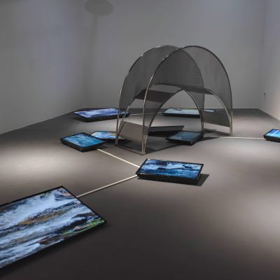 In the installation ‘A Bridge to the Landscape’ there is a schematic representation of a steel bridge with ten moving image screens each of which depict moving images of water flowing in different directions. The bridge signifies a passage from a digital or virtual presentation of a landscape into a real space. It is a work that probes the deeper question of how the real is constructed. The question of the constitution of reality is thus turned into the question of what sculpture is. This question is predicated on being able to articulate a spatio-temporal flux which serves as a schema for the real.