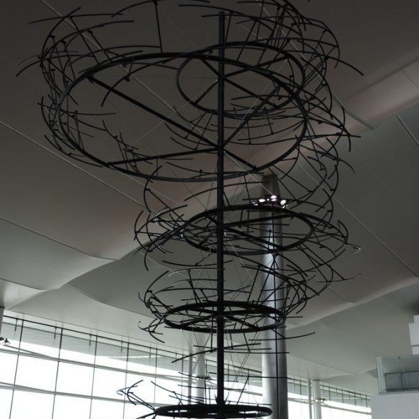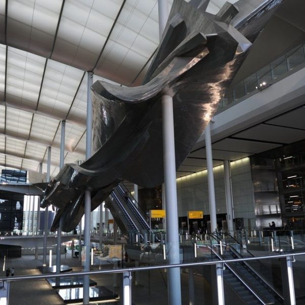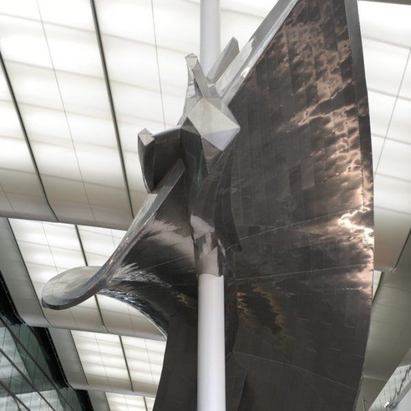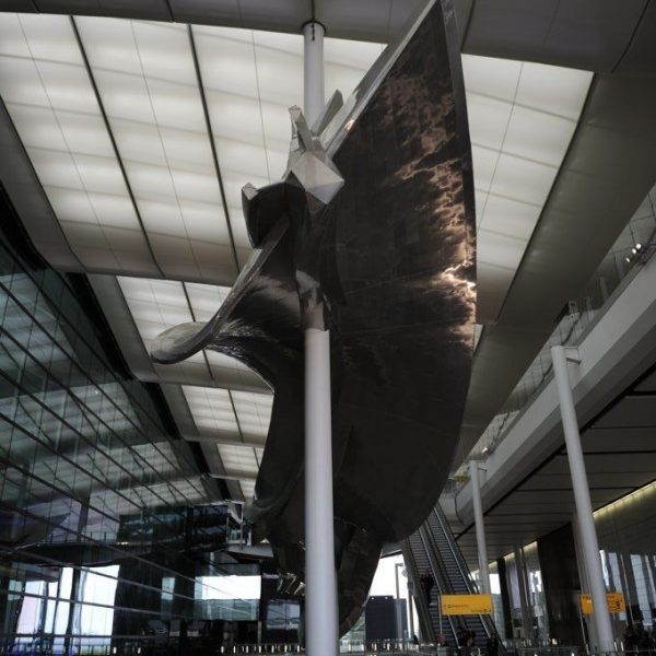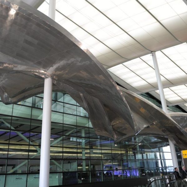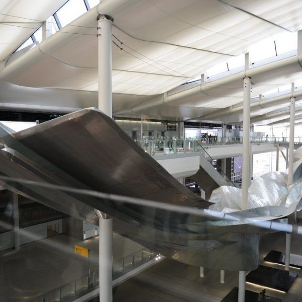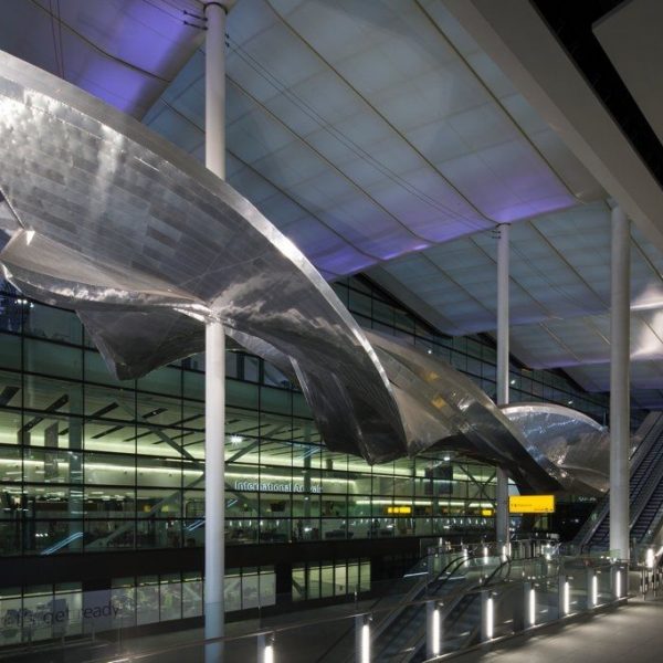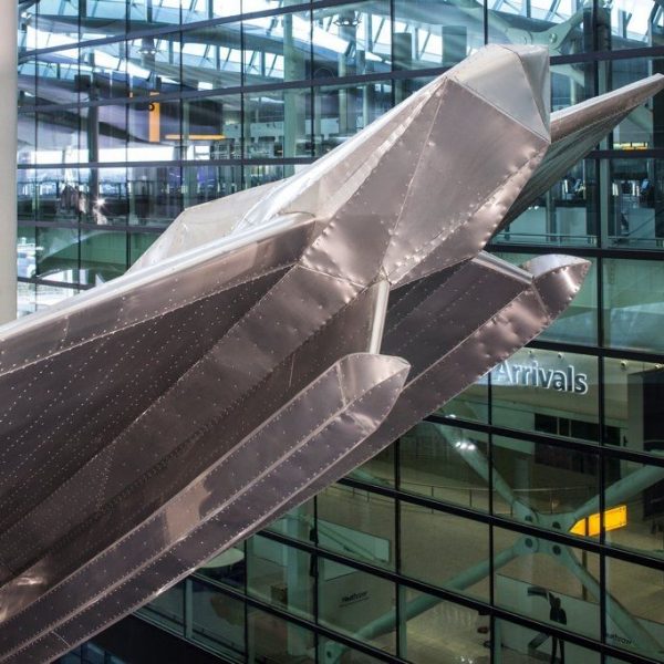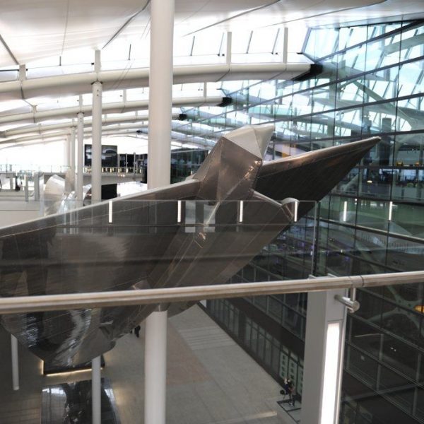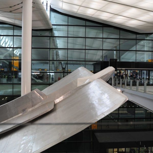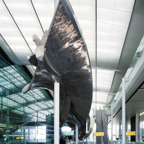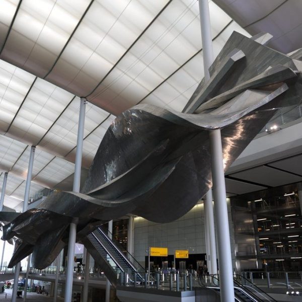 今天參加了一個很特別的藝術作品發佈會,第一個需要帶護照參加的藝術現場。今年6月4日,希斯羅第二航站樓“女王航站樓”正式整修完畢對外開放, 其中最引人注目的就是在旅客大廳當中的巨大雕塑作品 -《尾流》。這件被扭曲的77噸重,長78米的鋁皮作品模擬了飛機在飛行中劃過的氣流的形狀, 感覺和杜尚(Duchamp)《下樓梯的裸女(Nude Descending a Staircase)》還有翁貝托·薄邱尼(Umberto Boccioni)的《空間中獨特的連續性形態(Unique Forms of Continuity in Space)》有異曲同工之妙。理查德·威爾遜可謂是英國重要的當代藝術家,他在利物浦創作的《翻天覆地(Turning the Place Over)》在英國可謂是婦孺皆知,他把一整棟建築切割出一個圓形部分扭曲拼合,創造了如盜夢空間一般的視覺效果,整棟大樓變成了一件裝置做品。圍繞著《尾流》整件作品從創意到成型的4年間,有太多的故事可以說,從想法的成型,到紅牛特技飛行隊的實施,直到解決各種技術環節達成最後的作品呈現,可以說這是一個如同紀念碑一樣的作品,承載了當代藝術的最終夢想──激發人們創造的慾望與集體的狂歡。
