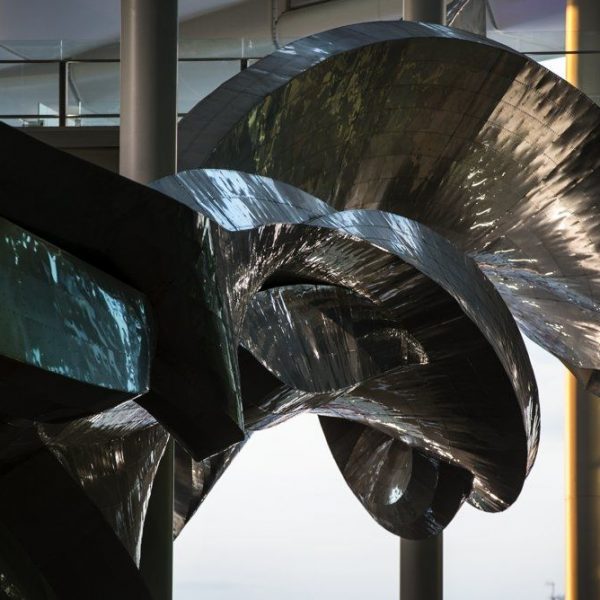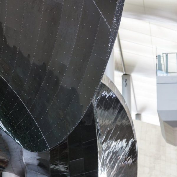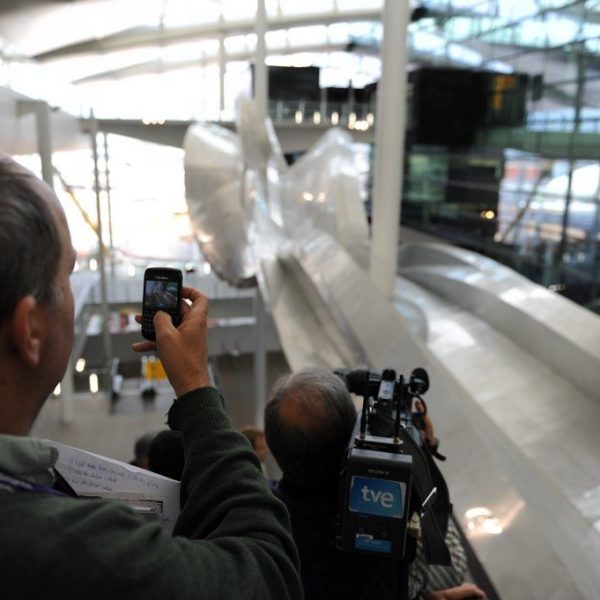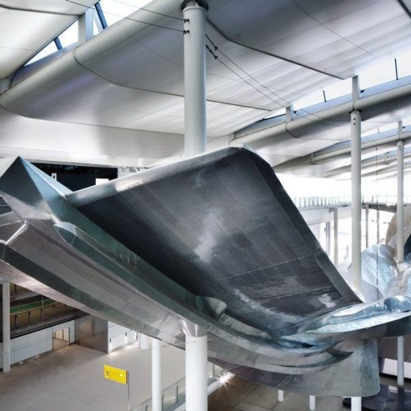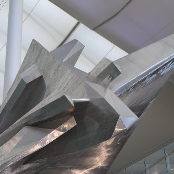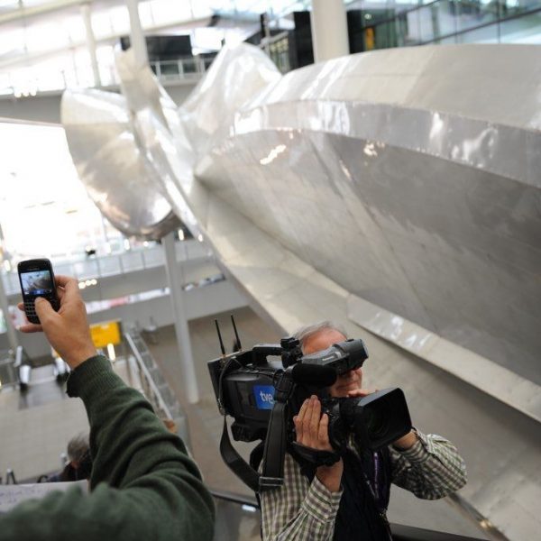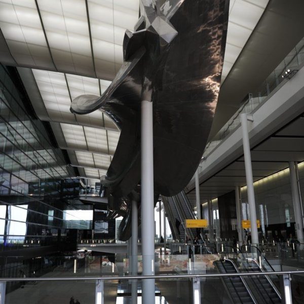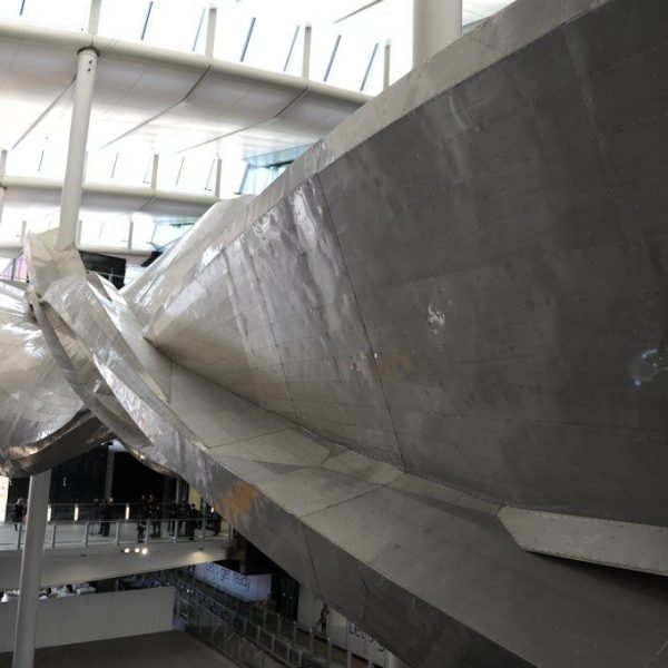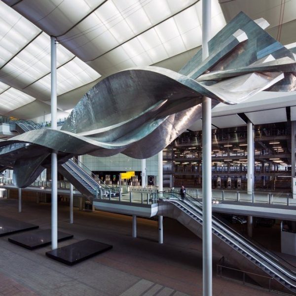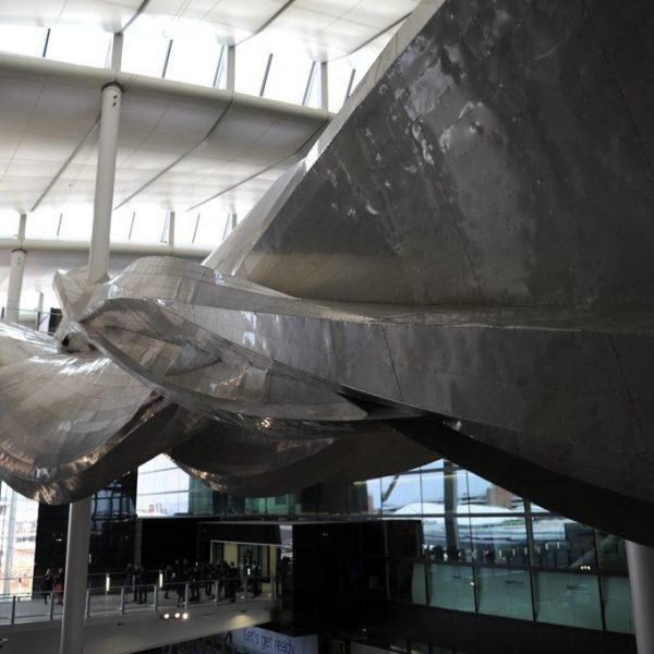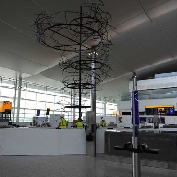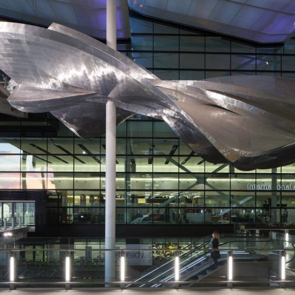 今天參加了一個很特別的藝術作品發佈會,第一個需要帶護照參加的藝術現場。今年6月4日,希斯羅第二航站樓“女王航站樓”正式整修完畢對外開放, 其中最引人注目的就是在旅客大廳當中的巨大雕塑作品 -《尾流》。這件被扭曲的77噸重,長78米的鋁皮作品模擬了飛機在飛行中劃過的氣流的形狀, 感覺和杜尚(Duchamp)《下樓梯的裸女(Nude Descending a Staircase)》還有翁貝托·薄邱尼(Umberto Boccioni)的《空間中獨特的連續性形態(Unique Forms of Continuity in Space)》有異曲同工之妙。理查德·威爾遜可謂是英國重要的當代藝術家,他在利物浦創作的《翻天覆地(Turning the Place Over)》在英國可謂是婦孺皆知,他把一整棟建築切割出一個圓形部分扭曲拼合,創造了如盜夢空間一般的視覺效果,整棟大樓變成了一件裝置做品。圍繞著《尾流》整件作品從創意到成型的4年間,有太多的故事可以說,從想法的成型,到紅牛特技飛行隊的實施,直到解決各種技術環節達成最後的作品呈現,可以說這是一個如同紀念碑一樣的作品,承載了當代藝術的最終夢想──激發人們創造的慾望與集體的狂歡。