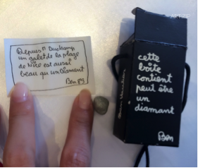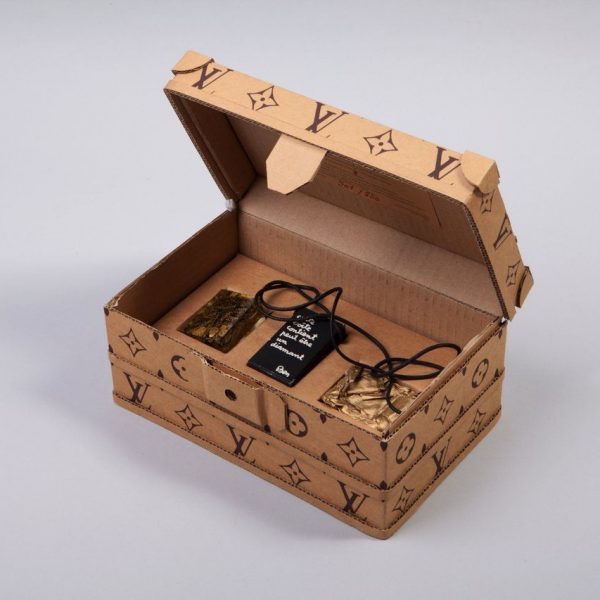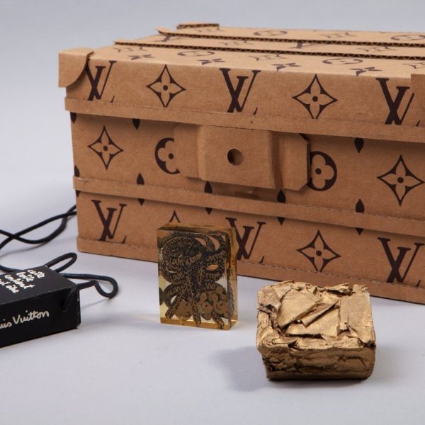 除去家喻戶曉的藝術家們, Didier 還收藏了許多天才藝術家的作品。在別致的仿古小圓桌上,一個小盒子吸引了我的眼球,Didier十分友好地為我打開了這個印有LV圖標的硬紙盒,並講述其中的故事–這是LV巴黎旗艦店開張時藝術家們為其作出的限量版設計,裡面有一個長方形矽膠Art Deco吊墜,一個長方形未來主義風格( Futurism)的胸針。以及一個拴有黑繩子的,可以做項鏈的盒子。Didier 第一次打開這個盒子的時候,裡面有一張小紙條橫幅,小心地包裹著一個石子。上面寫著法語‘自從杜尚畫過海以後,沙灘上的每一顆鵝卵石都是一粒鉆石。’
