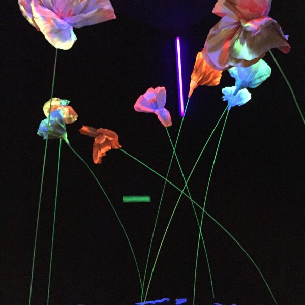 二戰之後如核彈爆炸所遺留的環境問題,由科技帶動的經濟快速發展和西方文化的強烈衝擊引起了日本社會的廣泛討論和思考,Kudo也通過他的藝術作品闡釋了他在美學、哲學上對於污染、科技和西方人道主義的深刻思考。’Garden of the Metamorphosis in the Space Capsule’展現了一個在UV燈照射下的詭異花園。巨大的人工假花零落地生長在幽暗的環境中,地上散落著破碎的人的肢體。裝置只能被從一個小門中窺探,可怕的綠色標牌上寫著 “for nostalgic purpose (為了懷舊)”。作品創造了一個怪異但極具視覺吸引的空間,其展現的衰敗頹廢惹人駐足觀看,但卻暗示著核污染后被遺留的、被廢棄的社會景象。Kudo在這件作品之後的形式更加畸形,顏色也更加飽和。