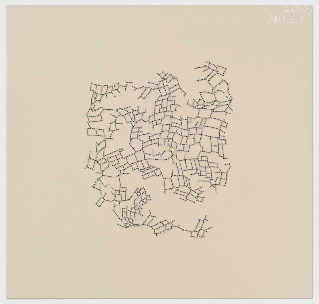 Hauser and Wirth’s Zurich show is a positively intellectual body of non-works that appear to want to disappear from view. Beneath the curved steel ribs that elevate up and into the ceiling, and the adjoining tiles pillars, this industrial mortuary styled space could well be completely empty, were it not for the wafer thin works and cotton thread installations that resonate from the walls like the residual effects of a series of ghostly séances. In which the slightest of works of art pay homage to the original principles of European concretism, (rejecting reality for a more concentrated interest in lines and colour), and the looser abstracted interests of non-concrete art. Curated by Rodrigo Moura, the show is comprised of the work of eight international artists who were originally active in the 1950’s, and some of whom are still practicing today. Including the work of Romanian Geta Brătescu, renowned for her destabilising drawings and collaged textiles; here her 8 mm film Les Mains, 1977, shows her hands feverishly moving in front of the camera, in what is as much a tailored drawing as it is a table top performance. Colombian Johanna Calle’s, Reticulas rotas III, 2010 – 2012, is a series of wire mesh two-dimensional drawings on board, in which the delineated patterns could well serve as a crude outline for a fractured cityscape from above. While Brazilian Marilá Dardot’s vitrine styled table work, ++ 2014, appears to loosely reference a grid, as all the works do, in its flora and fauna approach to the germination of principled aesthetics.