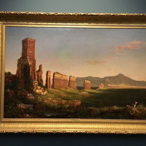 Cole’s career was shaped by his formative years labouring in the textile mills north of Manchester, and by his later study of the European masters whose works he travelled to see in London, Paris, and Rome. Following his return to New York late in 1832, Cole painted his greatest works in response to his time abroad. Working from drawings and oil studies, he completed his epic painting cycle ‘The Course of Empire‘ and ‘The Oxbow‘ almost simultaneously in this period – both of which may be seen as the culmination of what he took away from his experiences in London, Florence, and Rome. ‘The Course of Empire‘ depicts the rise and fall of an imaginary civilisation in an ancient style. ‘The Oxbow‘ was a challenge to the American public to consider its place in the natural world, and to keep in check the seemingly inevitable drive toward destruction.