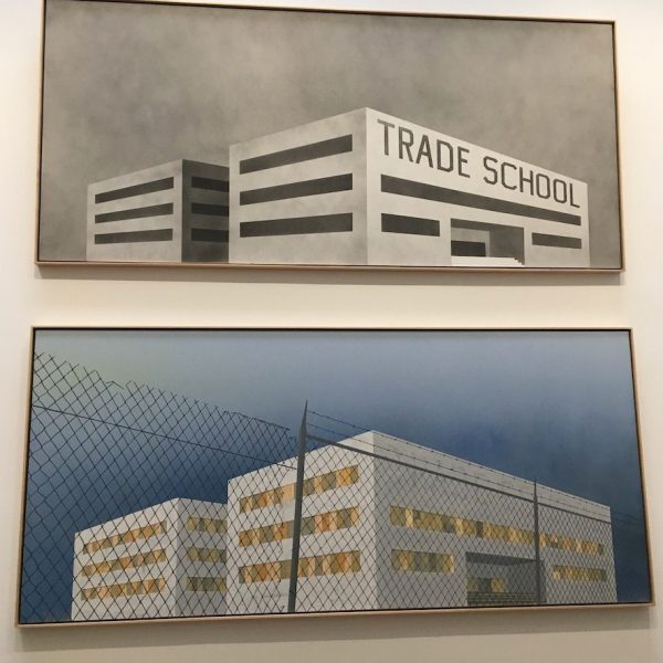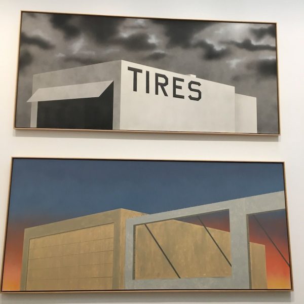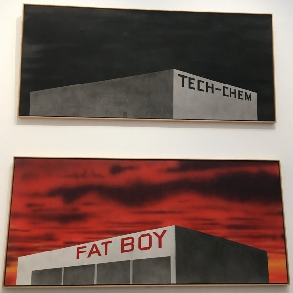 Cole invented a genre of specifically American landscape painting. In ‘The Course of Empire‘, he traced the rise, glory, and inevitable destruction of an imaginary civilisation and his series ends in war and destruction. Ruscha also invented a new way of seeing his city and a new American urban landscape tradition. However, unlike Cole’s grandiose vision of the rise and fall of an imaginary classical civilisation, Ruscha’s ‘Course of Empire‘ shows the industrial buildings of Los Angeles – simple, box-like, utilitarian structures with no pretension to beauty, but suggestive of economic impact and global corporate relationships.