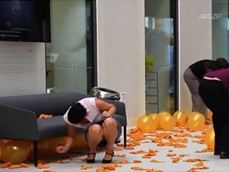 JT: 這個作品是影像與現場相結合的一個作品。視頻裡的女士們是在公司舉辦活動後將氣球刺破,而畫廊現場的氣球則印有軍事行動的名稱:“沙漠風暴”,“狂暴怒火”等等,那些名字是那麼的浪漫。它們是英雄主義式的,它們是煽動式的,它們是理想主義的。那些爆破帶來的恐懼總是突然發生,而我們總能微妙地把這種恐懼轉化為見慣不怪的事情。正如人們對待戰爭的態度。