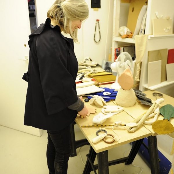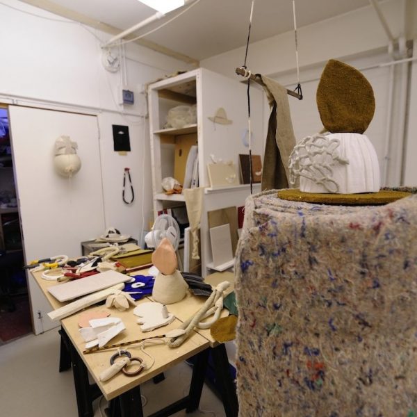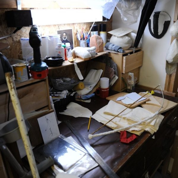 我努力使工作室保持整潔,並於特定角落進行特定的工作,例如,我會在這片區域使用熱板和石蠟,而另一邊則是進行木工活的區域,還有一個角落是我繪圖和縫紉的地方,因此這個特定的角落就需要盡可能地保持整潔。我認為的整潔應該是井井有條的,但其實我很容易失控,一不小心就把所有東西都翻了出來。而我最能讓自己抓狂的其實就是從一個程序步驟跳到另一個,這經常把工作室容易弄得一團糟。我一般都能記住工具放在哪裡,除了鐵錘,我總是找不到,所以現在我有三把鐵錘。工作室之所以會變得如此雜亂的部分原因也在於我喜歡自己被作品包圍的感覺,散落各處的各種布料和作品小樣就像立體草稿本一樣。我只會收拾那些已經完成的作品,不過很多時候它們又會被新的作品而淹沒。