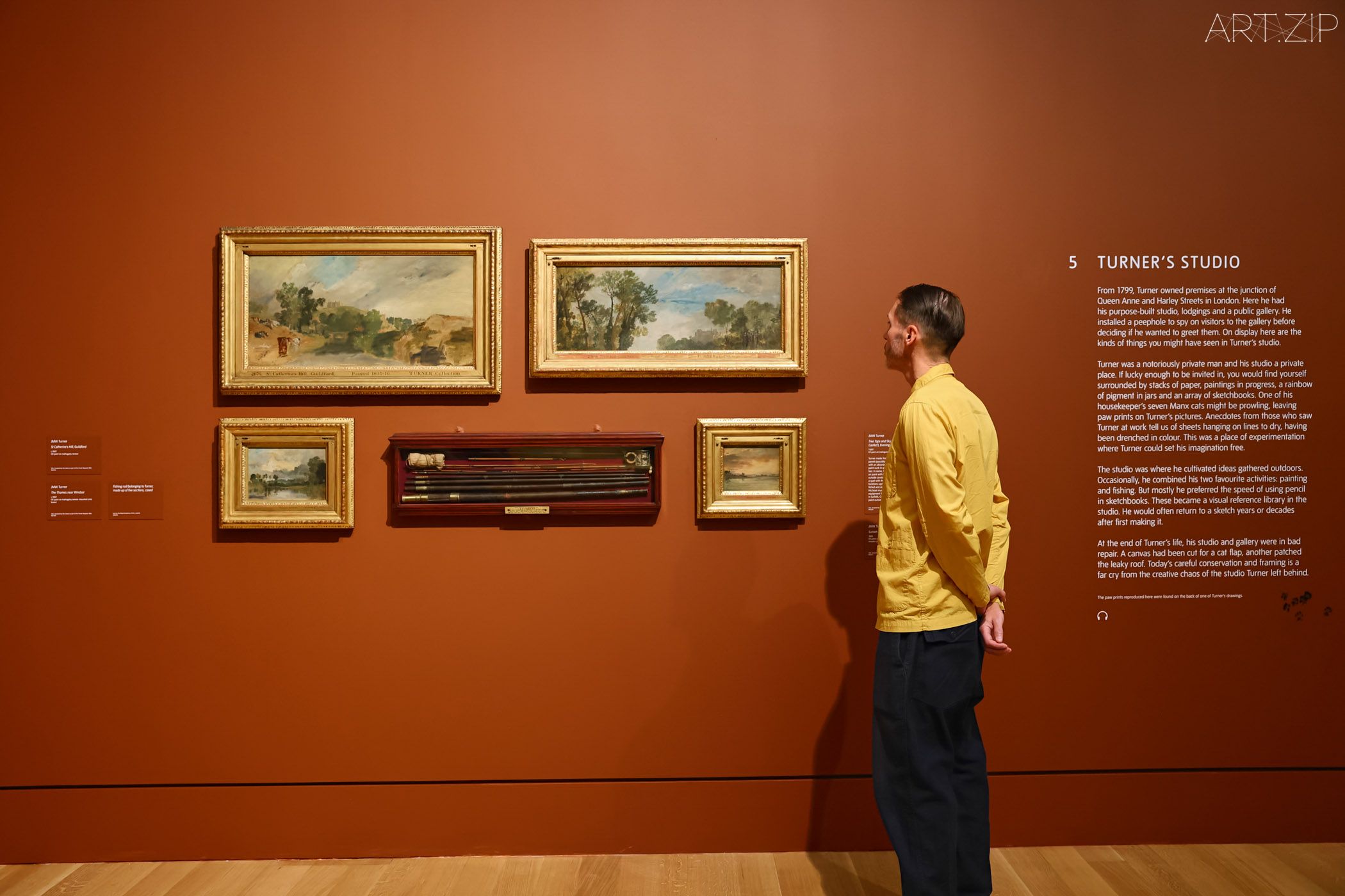 Throughout the galleries, the curators’ attention to detail is palpable. Cat paw prints appear on the walls, a playful touch referencing one of the seven kittens kept by Turner’s housekeeper. These humorous traces soften the usual solemnity of an exhibition of landscape masters and lend a humane charm to the history. In addition, quotes from period criticism are printed directly onto the walls, forming a parallel reading of historical commentary and the works themselves.