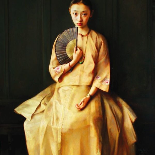 Li Guijun, born in 1964 in Beijing, explores through his oil painting the dynamics of women in a photo realistic fashion. Li graduated from oil painting at the Central Academy of Fine Art (CAFA) in Beijing in 1988. Then he continued his education and received his MA in 1995. He learned his signature realistic oil painting technique from Professor Jin Shangyi and Yang Feiyun at CAFA. In the portrayal of figures, the young, almost teenager like woman has been one of his main subject. He uses his brush to create a very sensitive, pure and fragile atmosphere surrounding his thin and delicate women. The light and plain background makes the figures not only surpass the metaphorical space that has been created in the paintings, but also stand out in front of viewers’ eyes. One may link Li’s painting with the traditional Chinese aesthetics of ‘Sick Beauty’, such as Daiyu in the Dream of the Red Chamber. The delicacy of the women’s gestures and facial expressions in Li’s paintings may also evoke the elegance of fairies. The artist may have found an intimate space in his paintings. His women always seem to have some sort of thinking, maybe about her life or her lovers. The artist’s intention is to deliver a sense of vitality behind these grieved and cold women. The paintings successfully capture the beauty and the vigour of a specific moment in one’s life.