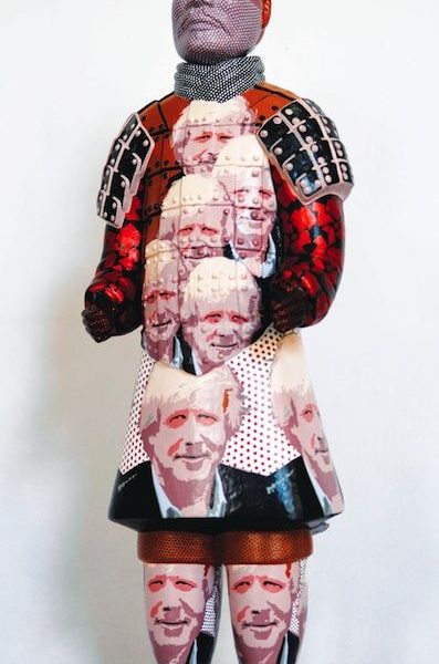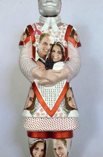 For instance, Liu Fenghua and Liu Yong (born in 1956 and 1971 respectively) recently created a series of ceramics, namely “New Terracotta Warrior and horse” series ‒ around 60 centimeters high – coloured in acrylic that play with multi-layered recognizable icons from ancient to contemporary times. While at the first sight their sculptures clearly evoke the unearthed terracotta army of the Emperor Qin Shi Huang‒ which date back to China’s first dynasty from 221 to 206 BC – the colourful motifs covering their whole bodies recall today’s celebrities from the political, intellectual and artistic world, such as Chairman Mao Zedong, Barack Obama, Marilyn Monroe, Mickey Mouse, the Queen Elizabeth II, Duke and Duchess of Cambridge̶Prince William and Kate Middleton, and so on. The mingling of ancient heroism and theatricality embodied through the images of Emperor Qin’s soldiers, pop art icons, and formal features such as abstract forms or indigenous designs ascribe to Liu’s soldiers an entirely new dimension yet inscribed in past references. One may argue that Liu’s soldiers are equipped with funny modern touches that recall members of the Red Guard in the Culture Revolution almost more than 30 years ago. Therefore, the tragic heroism reflected on the young faces of the soldiers seems to tell a story of its own.