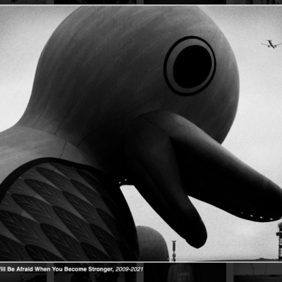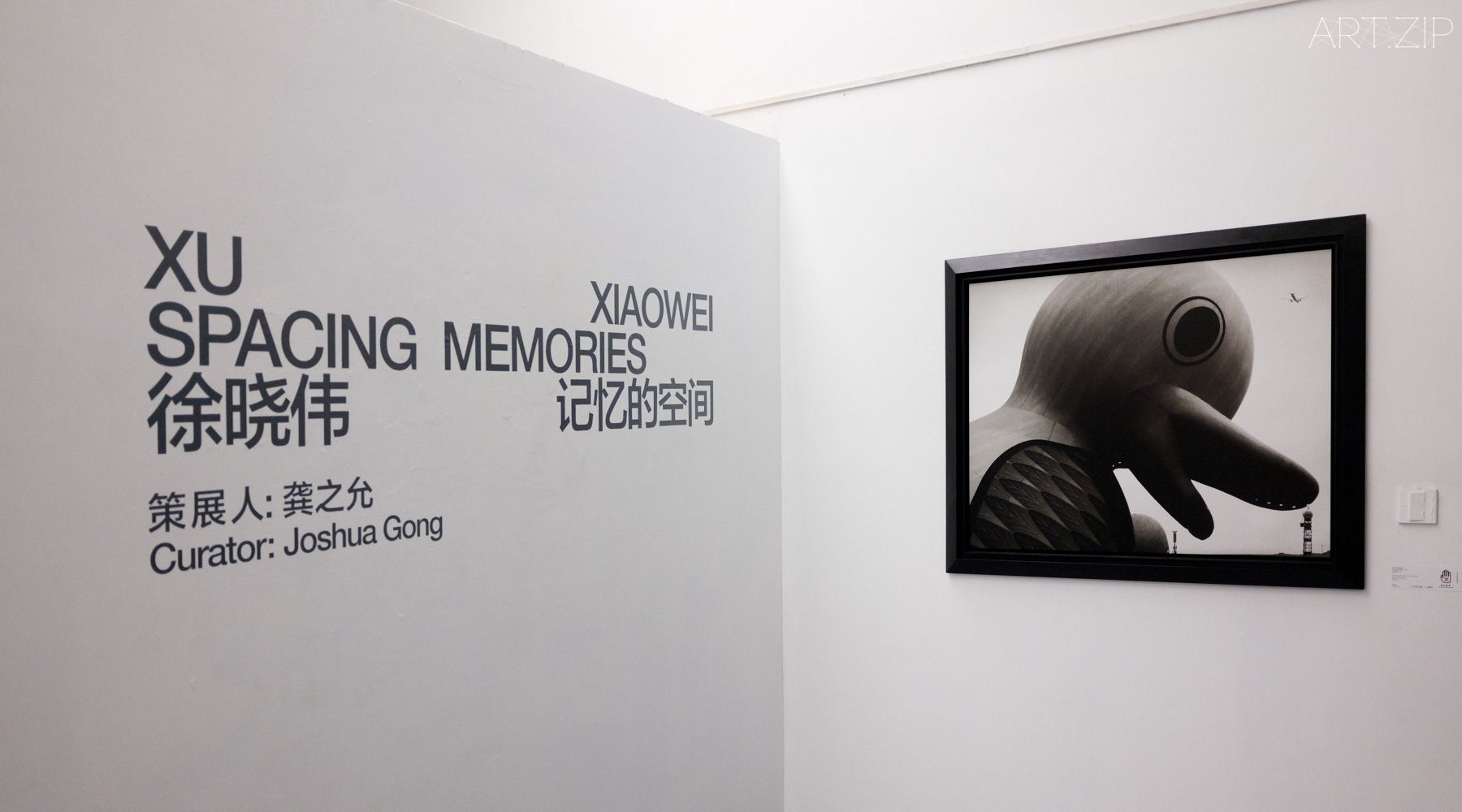 展覽空間節奏舒緩有致,入口處標題旁陳列的作品《變強了他們就會怕》,以一隻比高塔更為龐大的充氣鴨子,呈現出現實景觀的異化與威權感。充氣鴨子的物理特性,在徐曉偉的鏡頭詮釋下,被賦予了一層寓言般的人文色彩。看似蒙太奇式的圖像拼貼,使畫面的黑白層次呈現出記憶顆粒般的感官質地。