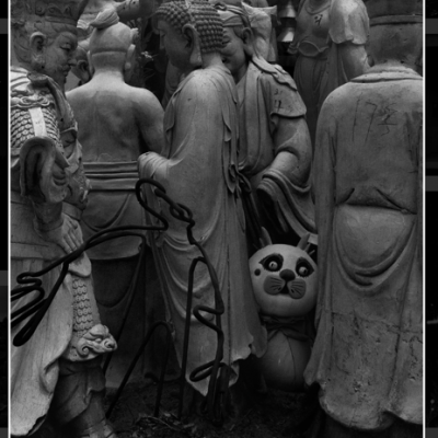 The form of deities can give viewers different feelings in different contexts. When statues of gods are enshrined in temples, the lighting, incense, and sounds make us respectful. Those statues placed high up receive the admiration of believers. It’s hard to imagine, in a place where gods are made, when we look at a pile of deity statues from a level or even a bird’s-eye angle, the sanctity and rarity of the ideal projection are dissolved by mundanity. The Feast of the Gods has a strong expression of absurdity. The appearance of the panda image, which seems neither purely good nor evil, also highlights the theme of the work. When we observe pandas in zoos, they are assigned a cute image; it seems their wildness has been removed or placed within our controllable range. Pandas actually once possessed immense vitality and fighting strength. It is our human cultural construction that has labelled both pandas and deity statues.