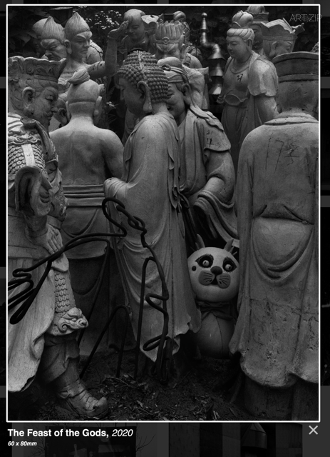 《眾神之宴》神的造型在不同的場域會給觀者不同的感受。當神像被供奉在廟宇中的時候,光線、香氣和聲音,都會讓我們肅然起敬。那些個被放置於高處的神像,會得到信徒們的瞻仰。很難想象,在造神的場地,當我們用平視甚至是俯視的角度來看待一堆神像時。那種理想投射的神聖性和稀有性,被世俗性所瓦解。眾神之宴有著很強的荒誕表達。亦正亦邪的熊貓形象的出現,也點亮了作品的主題。當我們在動物園中審視熊貓的時候,熊貓被賦予了可愛的形象,似乎熊貓的野性被去除了,或者被置於我們可控的範圍內。熊貓實際上曾經擁有非常頑強的生命力和戰鬥力。是我們人類的文化構建,把熊貓和神像進行了標籤化。