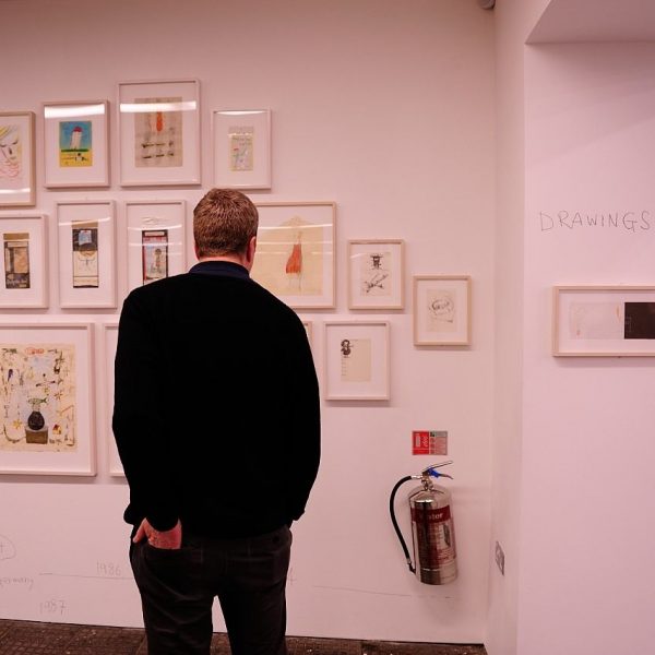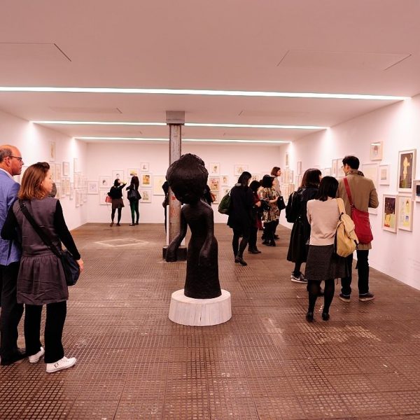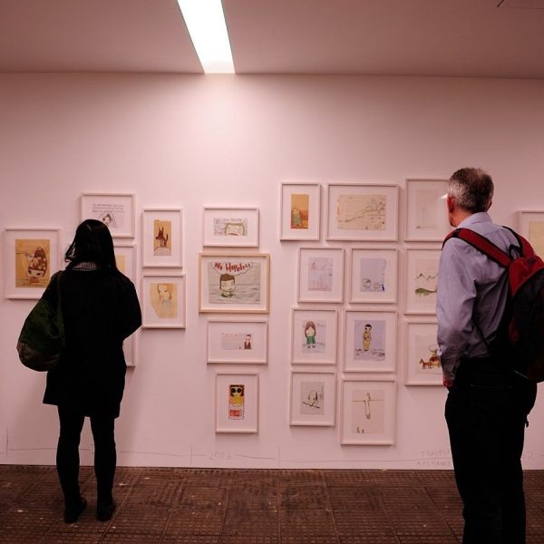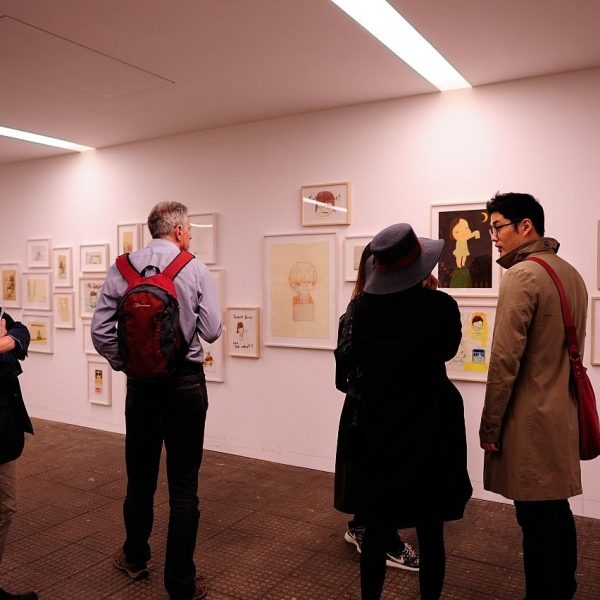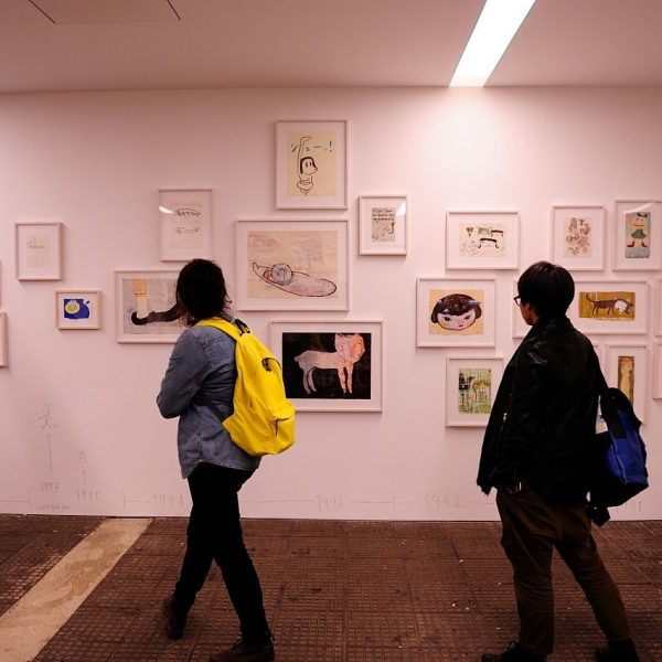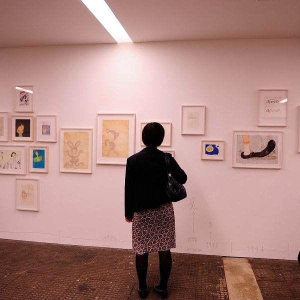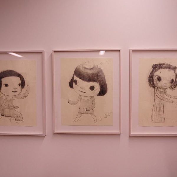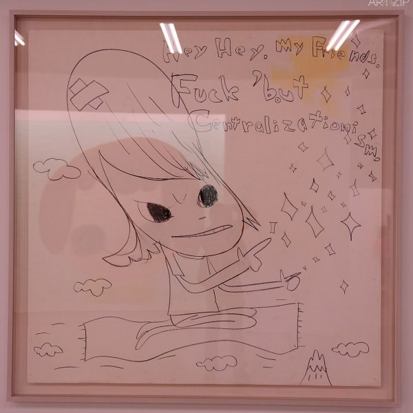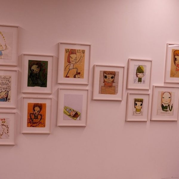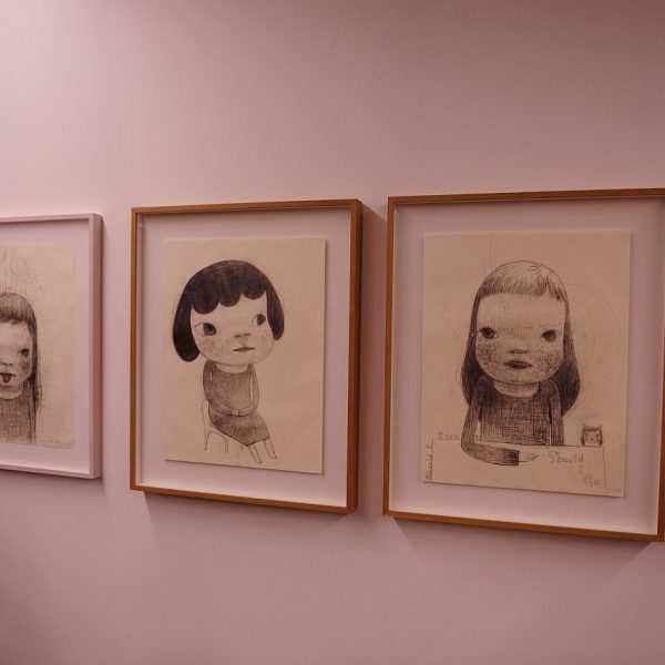 Apart from new oil paintings and sculptures, the exhibition also shows a large retrospective collection of Yoshitomo Nara drawings from the ‘80s of different geographic locations with a timeline of the years. We can see many sketches and free drawing, showing little scenes from life as well as images from his dreams and imagination, and shades of politics.