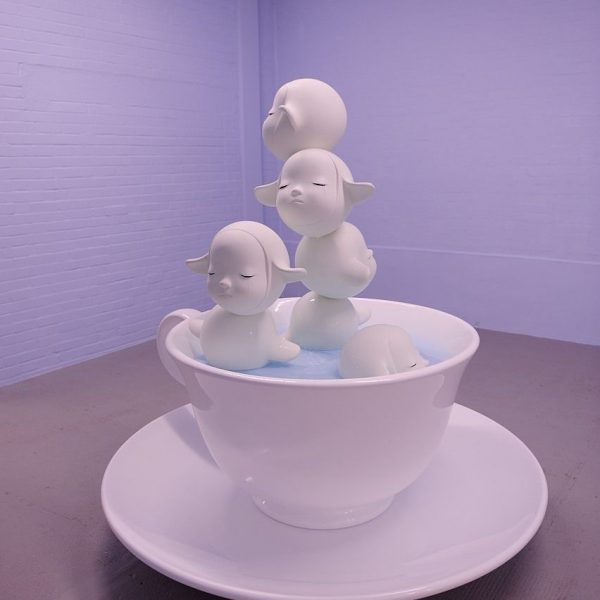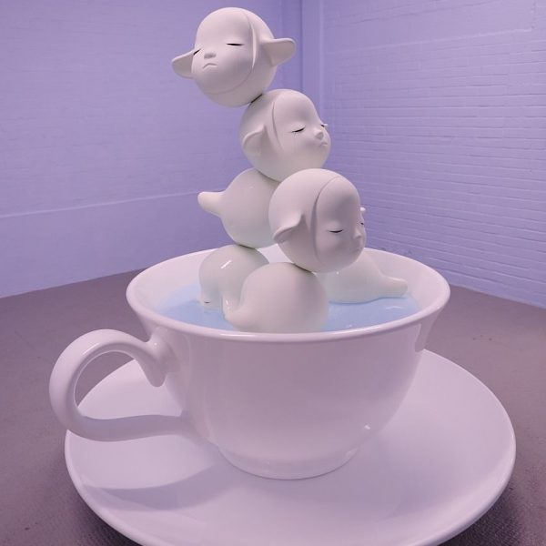 In the centre room of the gallery, stand bronze sculptures of different colour and sizes, magnifying the details of each small and subtle line of a face. The lines mix the reflection of the outside and inner world of the little girls, presenting their emotions directly to the viewer. In a small room there was one unique installation, a big white tea cup on top of a white saucer, with light blue tears inside the tea cup. Five toddlers are climbing inside; two of the toddlers are swimming in the tears, while three of them were floating on top of one another. They have their eyes closed, facing different directions in the room, as if they are the inner child of the Three Graces. Toddlers of pure white have their eyes naturally closed, tears dropping gently into the tea cup, only to be absorbed in their body, and to come out of their eye lid again. Almost like a repeating, sad song, showing that tears are unavoidable in the journey of growing up. The room is especially pure and clear with the interaction of light blue and pure white. When I first entered the room it had an aura of melancholy but after a while, a true serenity enveloped me.