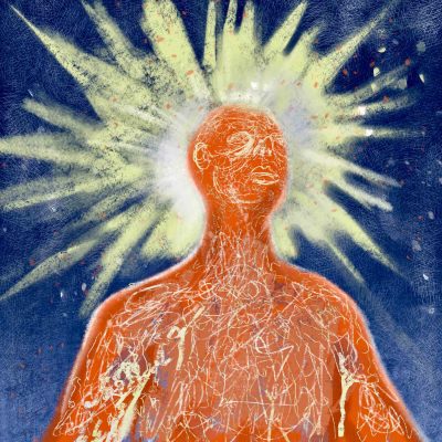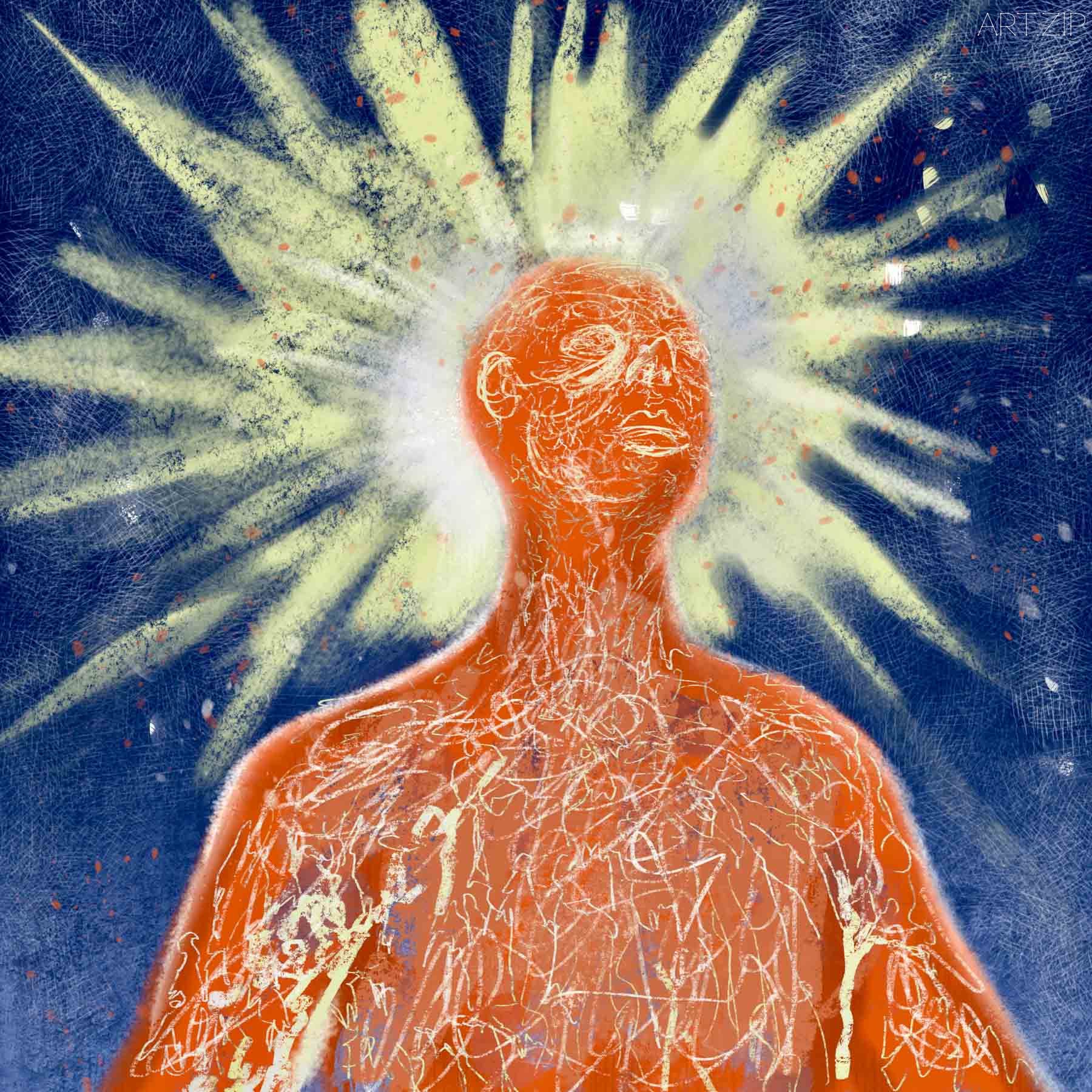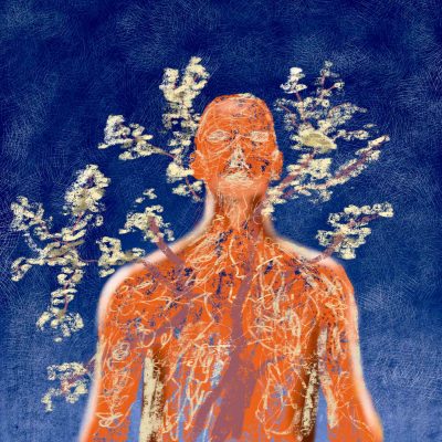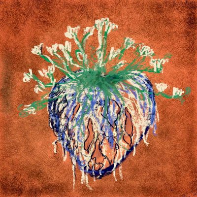 The colours are bright red, orange and the strokes drawn with paint and pen are gestural portraying a process of transformation within a state of human solitude and contemplation. The Back of Silence (2025) is the back of a figure, slumped to portray looking inward in contemplation; and there is energy bursting from the body through the swirling marks on the paper. In Awakening Light (2025) the figure stands facing out with an aura of bursting yellow light around its head, illustrating an inner strength, a new perception. With The Blooming Body (2025) the artist has drawn plants floating around the figure; the two are entwined in a symbiotic relationship. Transformation takes place across the sequence of these paintings. The fourth piece, The Heart in Bloom (2024), is the image of a human heart overlayed with sprouting organic life forms.